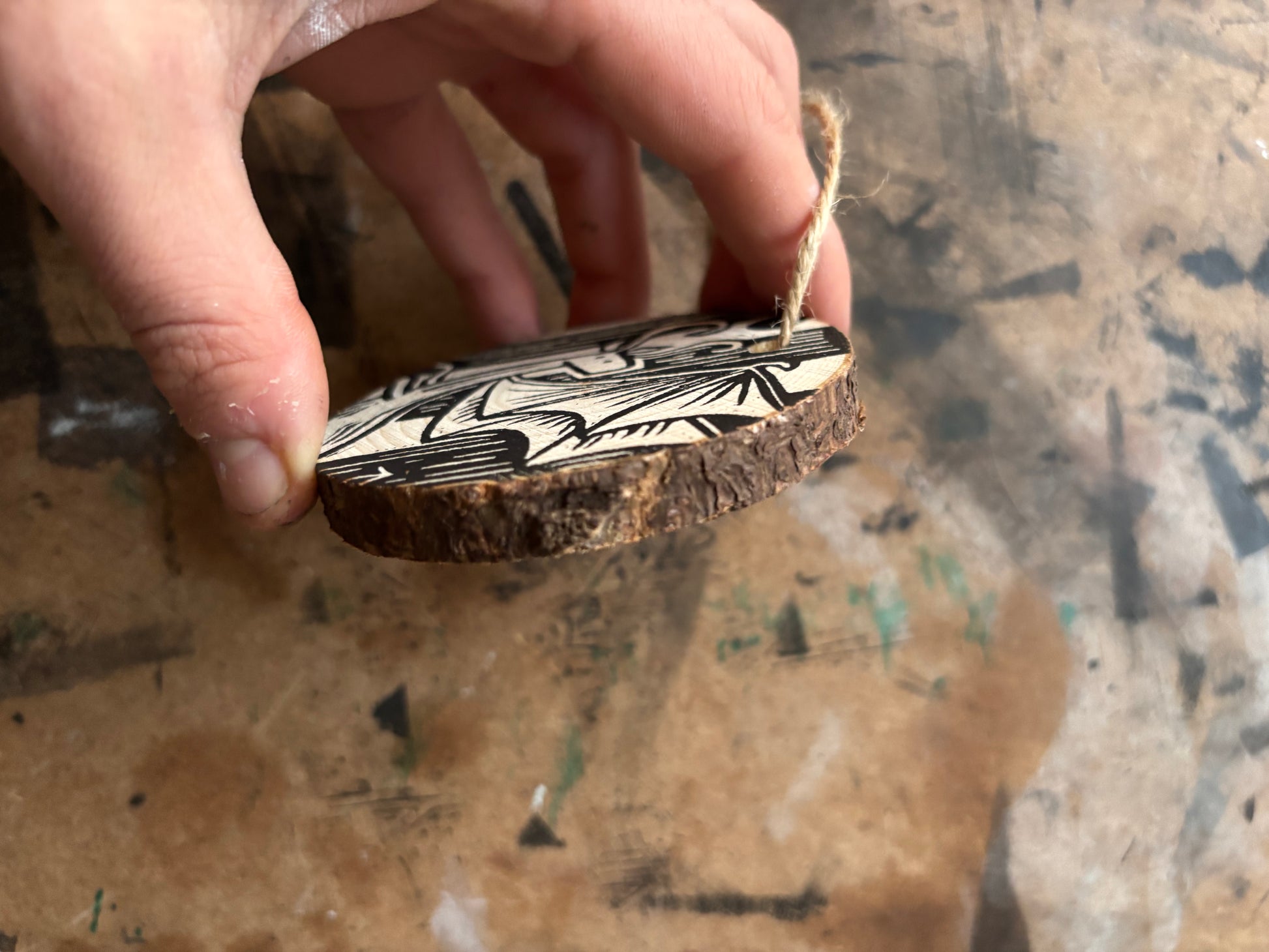wooden ornaments hand printed from a hand carved linoleum block