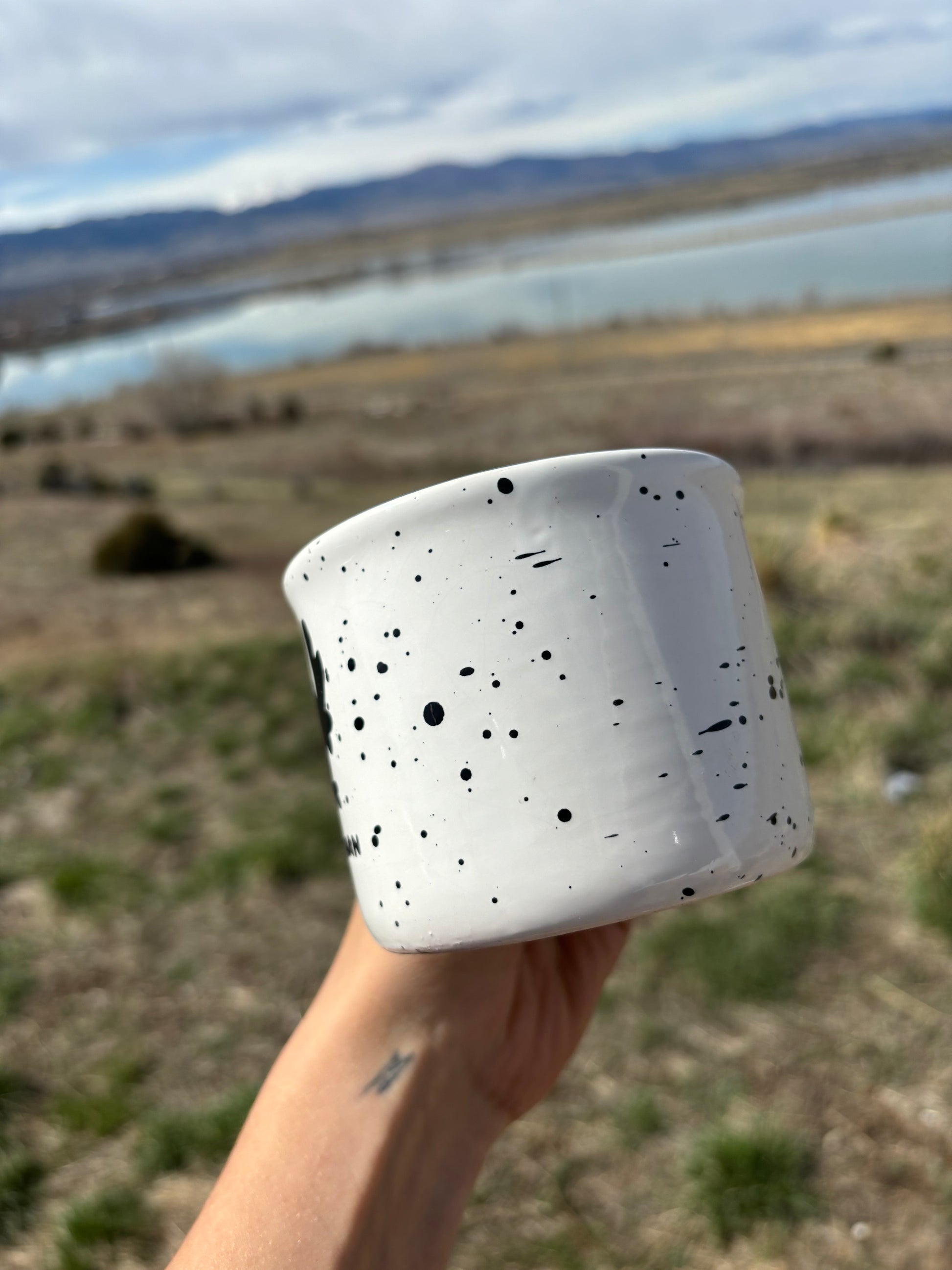 Mothman upcycled mug - red eyes - speckled