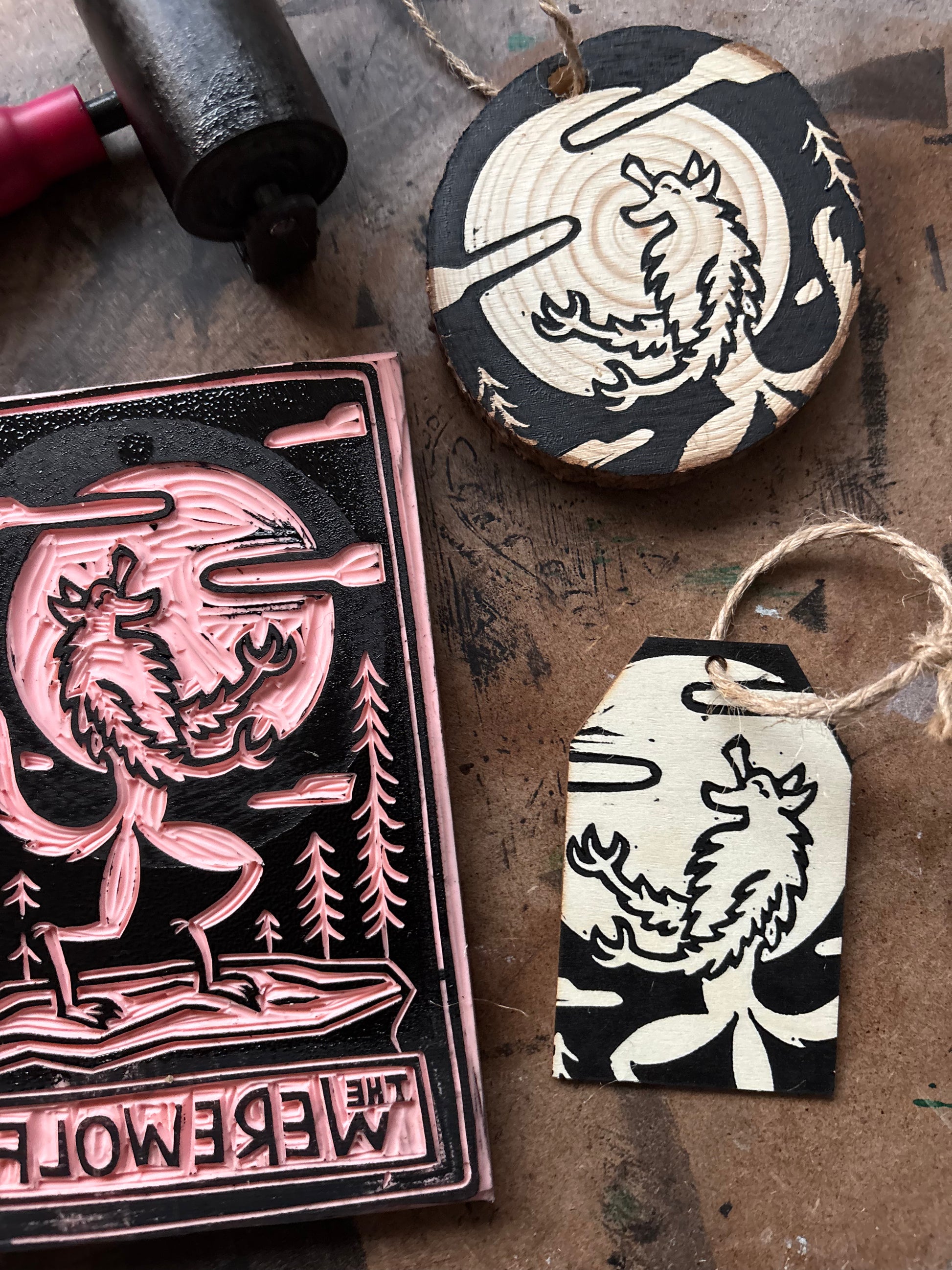 wooden ornaments hand printed from a hand carved linoleum block